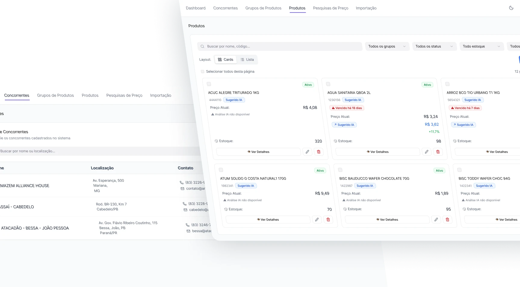 Uma plataforma completa que monitora concorrentes e marketplaces, cruza com seus dados internos e recomenda o melhor preço por SKU/loja, com explicabilidade e simulações “what-if”.